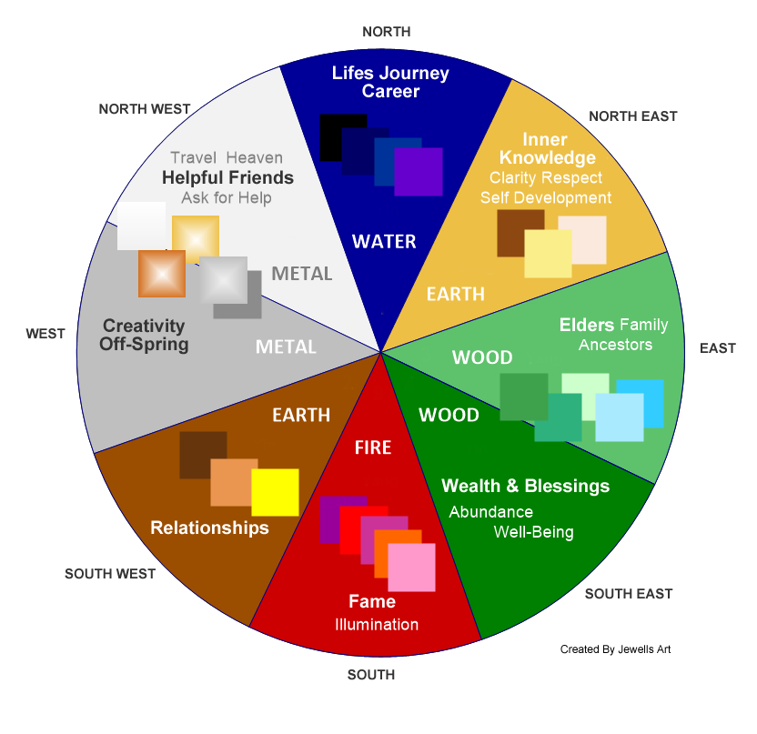 East - Family & Ancestors, South East - Wealth, Blessings & Well-Being.